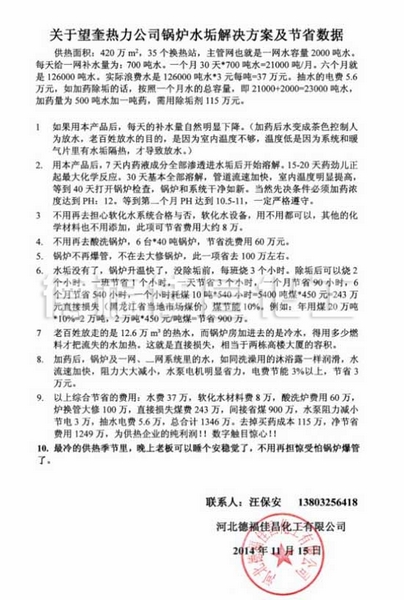 關(guān)于望奎熱力公司鍋爐水垢解決方案及節(jié)省數(shù)據(jù)